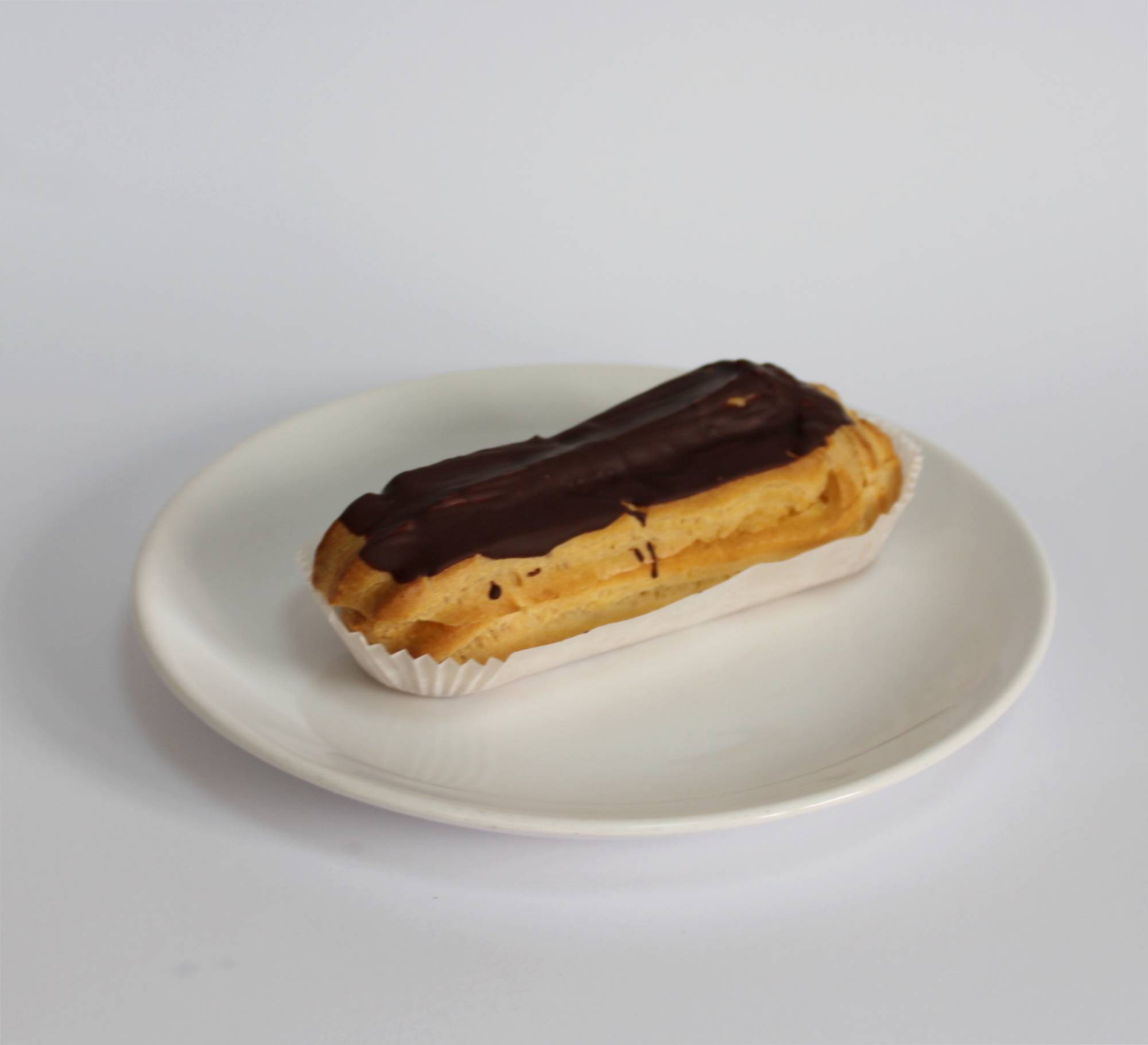 Ekler z kremem maślano-budyniowym, polany czekoladą.